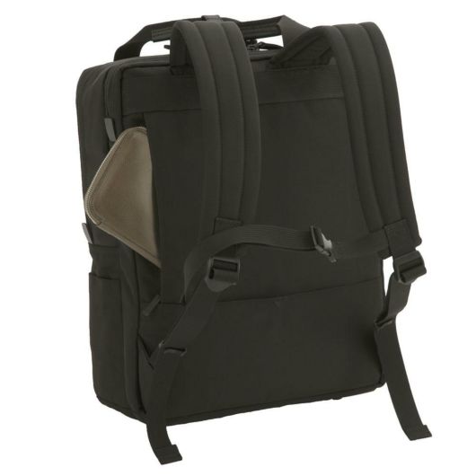鞄の中が見易いシルバーカラーの内装、底鋲、背面ショルダーストラップ収納ポケット、大きく開くL字ファスナー等。2種類の生地を使用したコンビネーションデザインと洗練されたフォルムが秀逸な2ルームリュック。