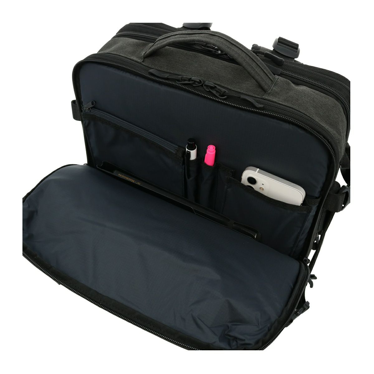 内側:ダブルファスナーポケット×2(内側:ベルクロ式PCポケット×1)
