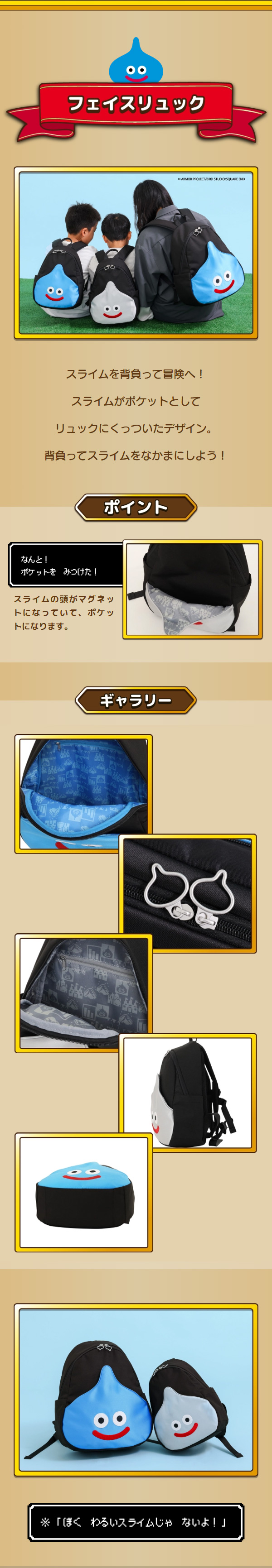 人気のスライムモチーフ。丈夫で汚れにくいポリエステル素材を使用。軽くて持ち運びやすく小柄な女性やお子様向けのサイジングながら、必要な物がしっかり入る実用的なサイズ。大人用(SSPK-02)との親子コーデもおすすめです。