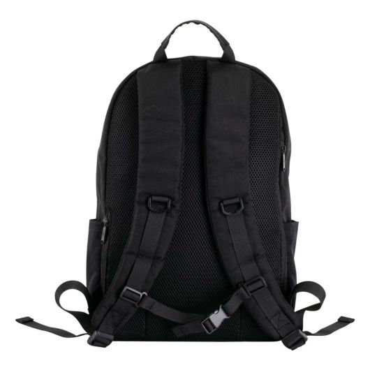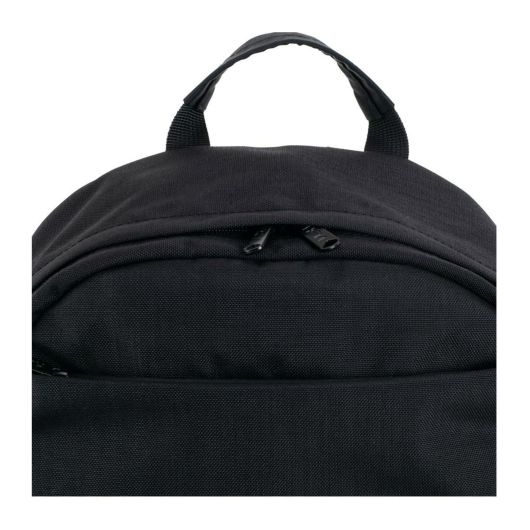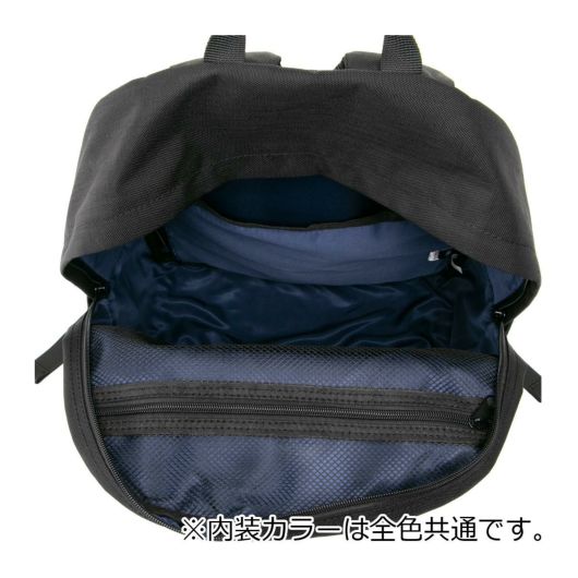 正面はシンプルでも底面のビッグロゴがアクセントに。背面にはスマートフォンやパスケースなどの出し入れに便利なポケットと中にダイレクトにアクセスできるファスナー付き。