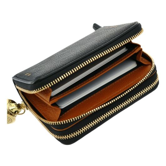 コンパクトなサイズながらもファスナーポケットを二つ備え、カードや現金を機能的に分けて収納できるアイテムです。