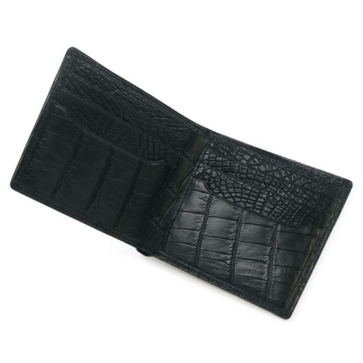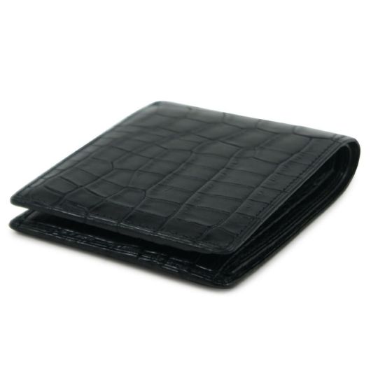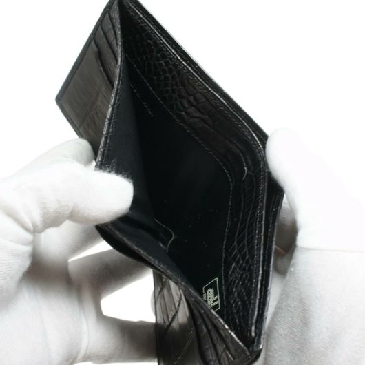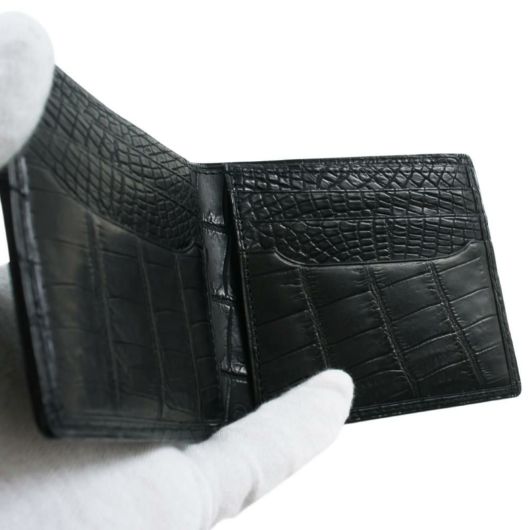 南アフリカ産の「ナイルワニ」革を使用した、高級感漂うマットブラック。ナイル特有の美しく細やかな腹部の鱗を使い、センター裁断しています。インナー素材にもイタリアンカーフを仕様するなど、最高級のグレードの商品に仕上げています。