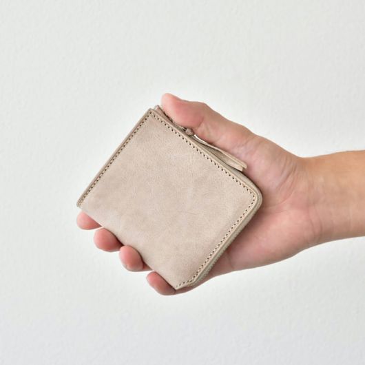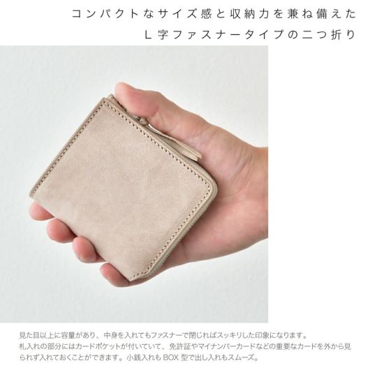 収納力たっぷりの手の平サイズ。コンパクトなサイズ感と収納力を兼ね備えた、L字ファスナータイプの二つ折りです。見た目以上に容量があり、中身を入れてもファスナーで閉じればスッキリした印象になります。札入れの部分にはカードポケットが付いていて、免許証やマイナンバーカードなどの重要なカードを外から見られず入れておくことができます。小銭入れもBOX型で出し入れもスムーズ。