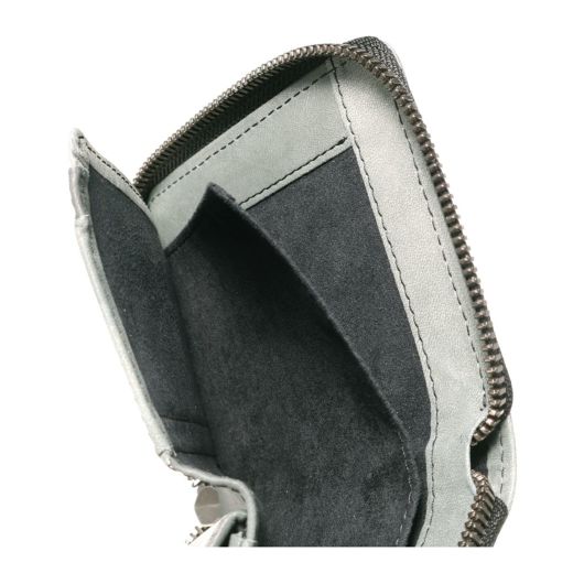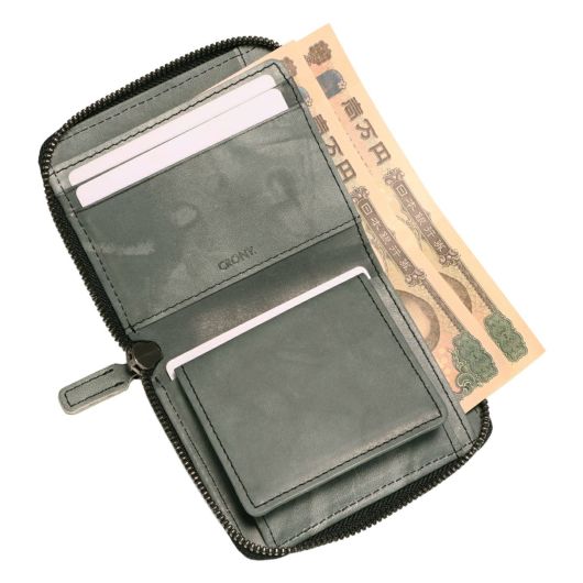 室町時代に活躍した水墨画家、雪舟の水墨画をオマージュしたムラ染めの革を使用。 本来、革の染色では色ムラを出さないようにするが、あえて色ムラを出すという遊び心から生まれた、他の革とは一線を画す革。 革の染色歴40年の職人が染料の投入量・色・太鼓の回転数・タイミングに 試行錯誤を重ね作り上げた大量生産が難しい逸品。