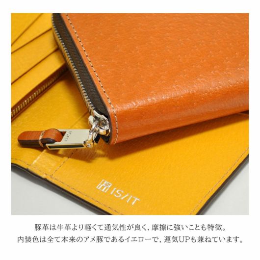 植物タンニン鞣し革を染色した後、グレージングで飴色に仕上げており、透明感のあるツヤ感やピッグ独特の肌目が魅力になります。