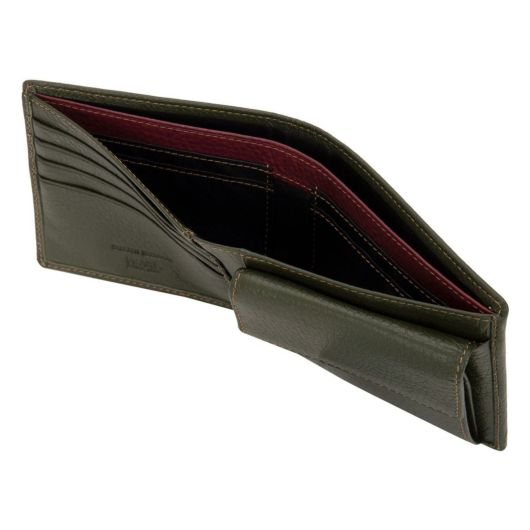 イタリアを代表するタンナーでなめされた鹿革は独特の柔らかい感触と軽さが特徴です。手触りの良さから“革のカシミヤ”と呼ばれる高級素材です。定番の二つ折りは使い勝手が優れており、ホック式の小銭入れが付いています。口が大きく開き2室あるので使い勝手が非常に良いです。