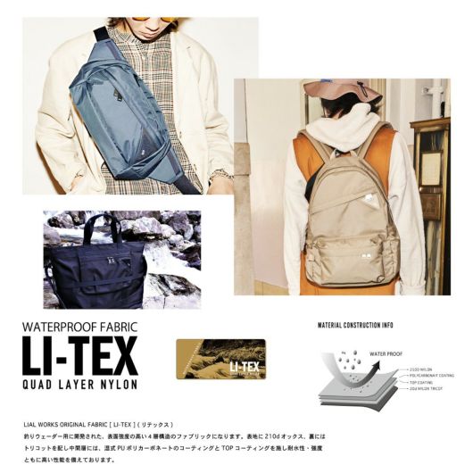本体生地には、CIEオリジナルファブリックLI-TEXを使用。210dオックスナイロンを表面に4層で構造された高機能素材になります、表面に弱撥水加工、防水性を備えております。ブランドタグにはYKK社製のクイックロンにエンボス樹脂加工でブランドロゴをプリントしたものをアクセント、タグの下生地には600dポリエステルのベースにポリウレタンコーティングを使用した生地を使用しております。ZIPにつきましては、メインにはビスロンファスナーに撥水剤にどぼ漬けしたYKK社製のVISLON WATER-Rを使用しており、スムーズな開閉性と持続性の高い撥水性を持っております、メイン以外にはコイルの裏使いのWATER-Rを使用しており、ファスナー全体的に撥水性を持たせております。釣りウェーダー用に開発されたベースの生地にフィッシングベストのディティールをイメージに作成したブランドタグでフィッシングイメージに仕上げたアイテムです。