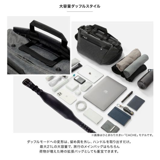 必要に応じてワンタッチでボストンバッグに変身!最大21Lに拡張するスリングバッグ『CACHE LITE(キャッシュライト)』は、シーンや目的に合わせてスリングからダッフルに瞬時にトランスフォーム(変形)できる大容量のハイブリッドバッグです。