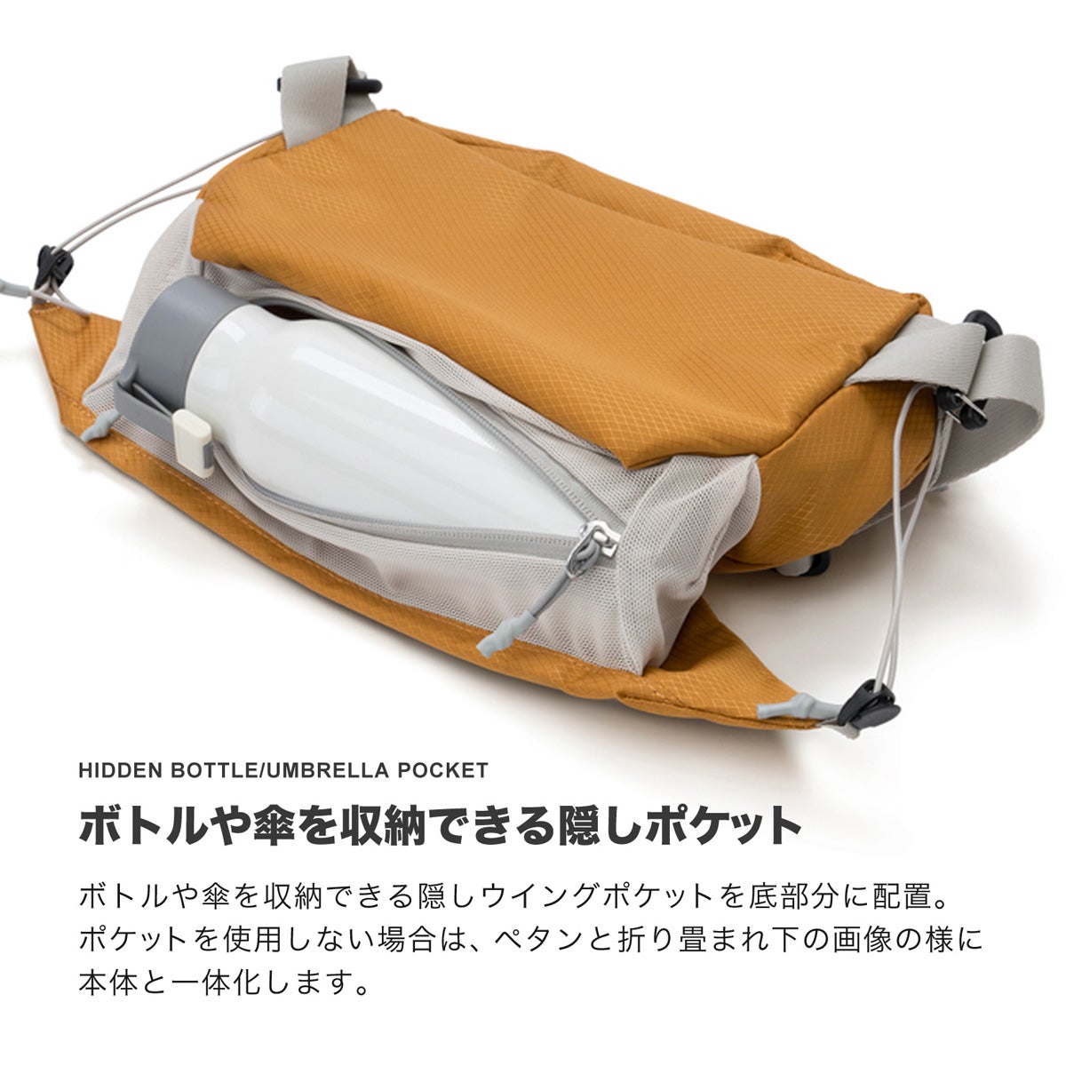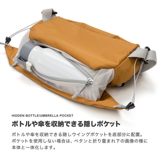 ボトルや傘を収納できる隠しウイングポケットを底部分に配置。