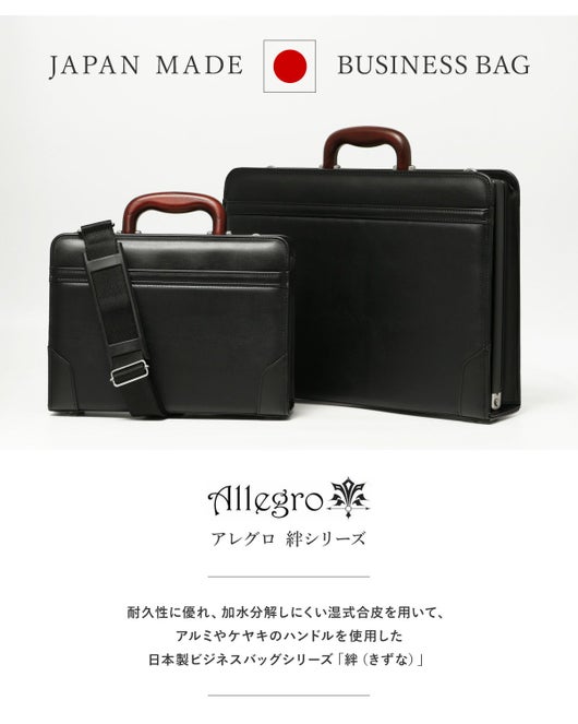 耐久性に優れ、加水分解しにくい湿式合皮を用いて、アルミやケヤキのハンドルを使用したビジネスバッグシリーズ。
