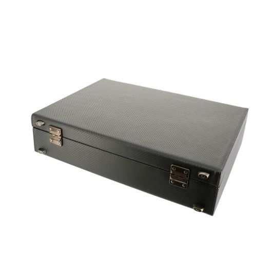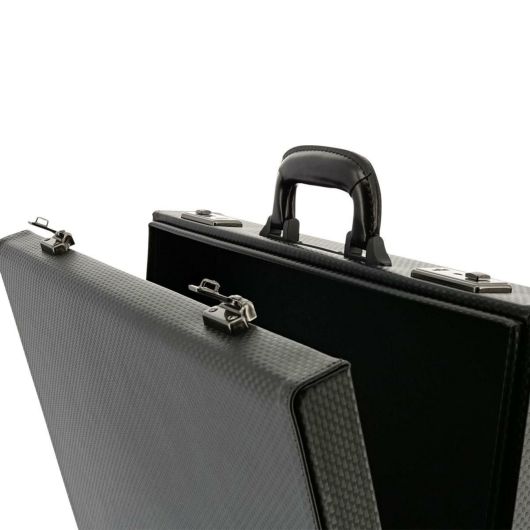 合成皮革でありながら、カーボン調のイメージを醸し出している本体素材を使用。また、ケースの箱枠には軽さと強度を両立させた合板を使用しています。現在、日本製のアタッシュケースは、弊社工場を含め数社しか生産できません。