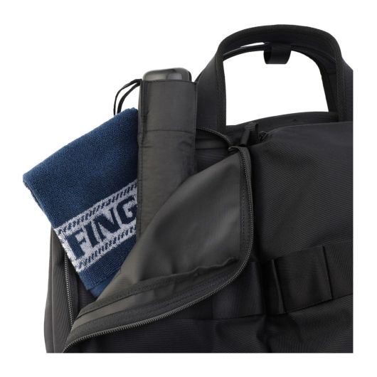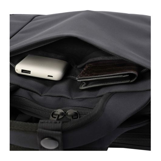 フロントにはマチを設けたポケットを配し、見た目に反した抜群の収納力に。