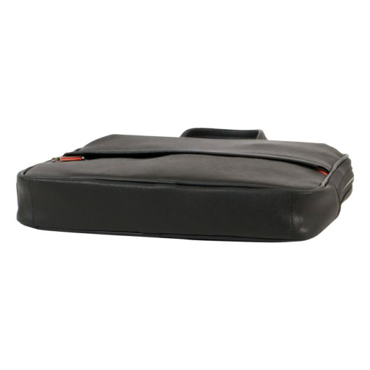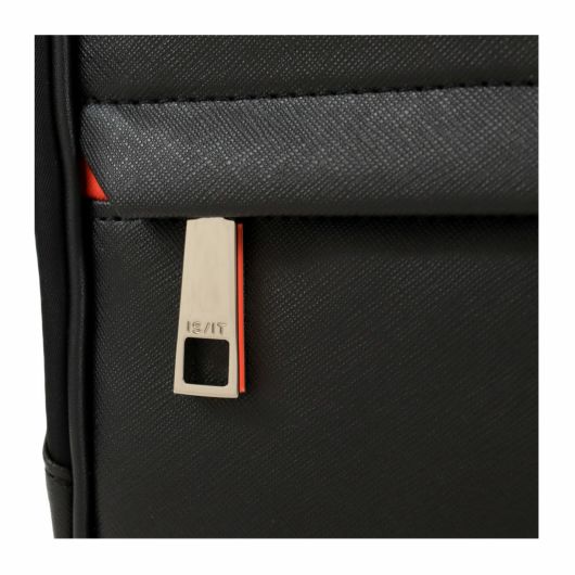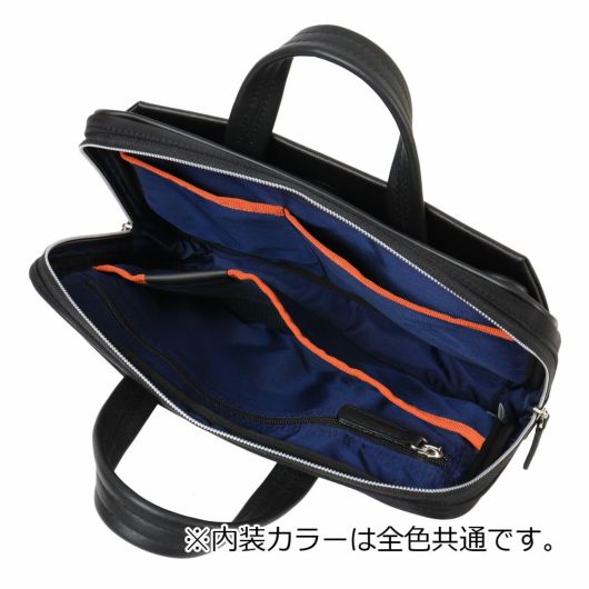 また、ビジネスバッグの前面・背面にはアオリポケットがあり、サッと取り出したい小物の収納やハンドル収納が可能です。フロントのファスナーポケットは浅型に設計しており、さらに内側は見やすいオレンジ色のパイル生地を使用することで、スマートフォン等を入れても画面を傷つける心配がありません。