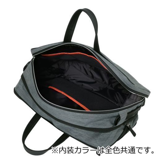 エコ通勤やジャケットスタイルにも合う、軽量ビズ~ビジカジトリップシリーズ「ルシェルII」。主素材にはシャンブレー調のポリエステル生地に撥水加工を施した生地を使用し、軽量に仕上げました。シンプルなデザインながらも、ハンドルが隠れる機能が特徴。フロントポケットの内側は見やすいオレンジ色のパイル地を使用。スマホなどの電子ツール収納に適したポケットなど機能性の充実したシリーズです。