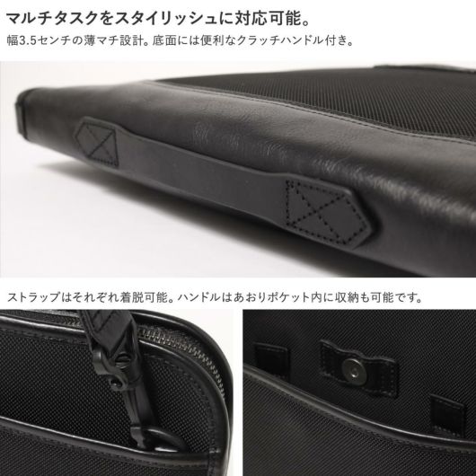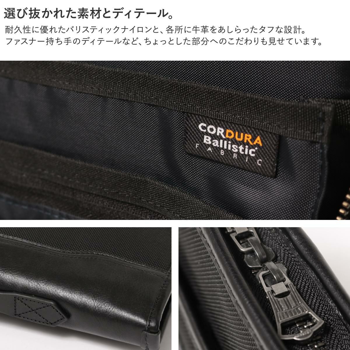 耐久性に優れたCORDURAバリスティックナイロンと牛革を使用したビジネスシーンで活躍する仕様満載の薄マチドキュメントブリーフです。用途やシチュエーションに合わせてブリーフ、ショルダー、クラッチと3WAYの持ち方が可能。小物の仕分けに便利なポケットを多数完備。