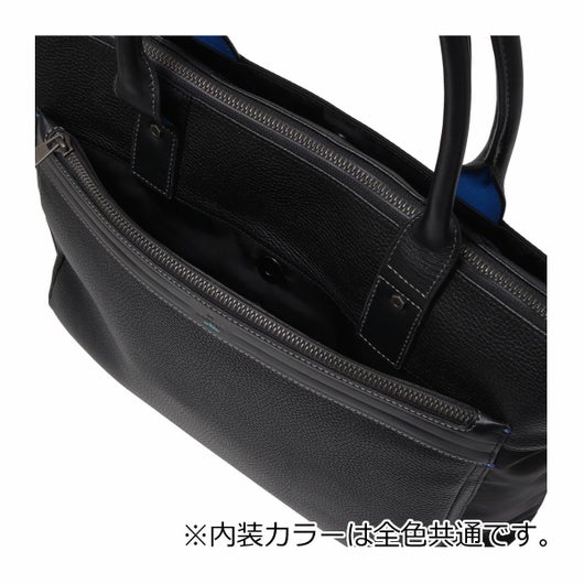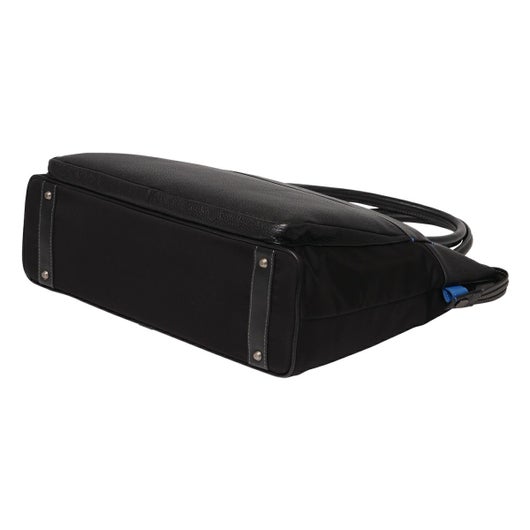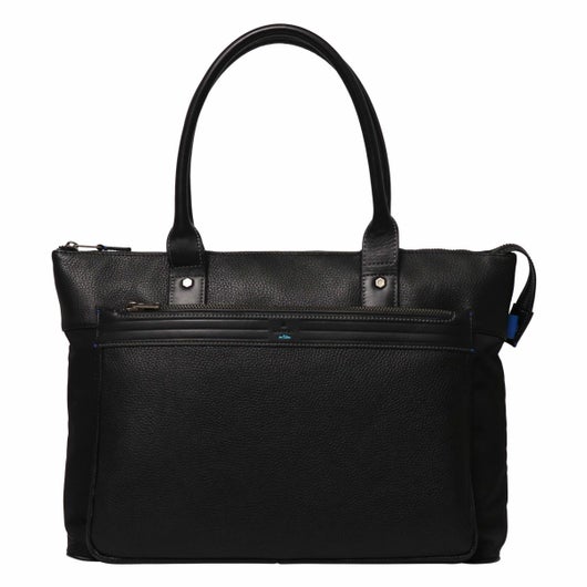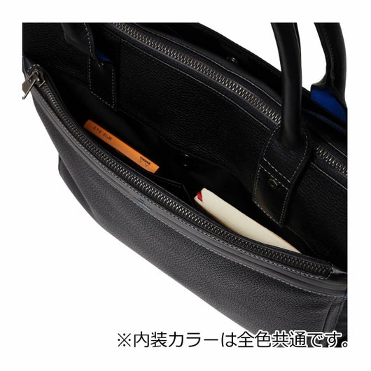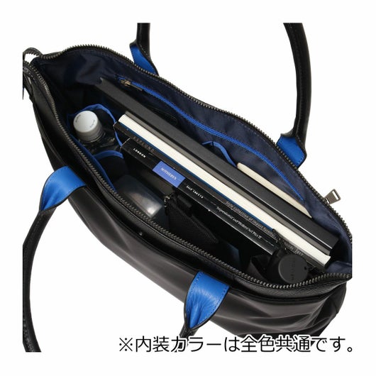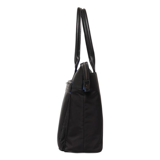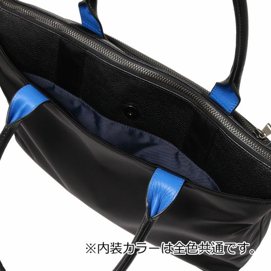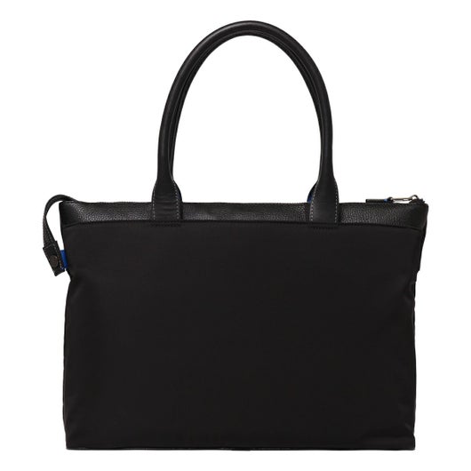 上品なテイストのカジュアルトートバッグに、3種類の素材を巧みにMIXしたLANVIN en BleuのB4サイズのトートバッグ。ベルト状のストライプエンボス加工がブランドらしい洗練されたポイントとなっています。メインルームは15.6インチのPCやペットボトルを収納可能で、小物ポケットも充実しています。