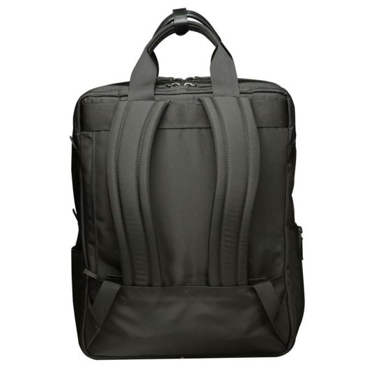 鞄の中が見易いシルバーカラーの内装、底鋲、背面ショルダーストラップ収納ポケット、大きく開くL字ファスナー等。2種類の生地を使用したコンビネーションデザインと洗練されたフォルムが秀逸な2ルームリュック。