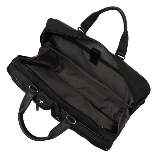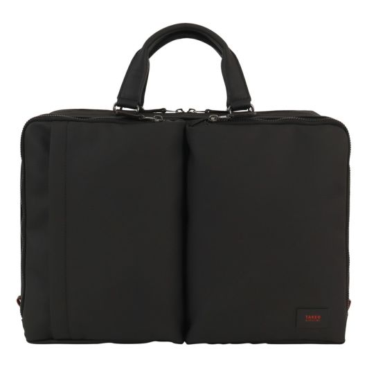出張にも対応したタケオキクチのA4サイズビジネスバッグ。斜め掛けとしても使える肩紐付きの2WAYバッグです。従来の出社型「オフィスワーク」と、自宅やシェアオフィスなどオフィスと離れた場所で働く「テレワーク」を組み合わせた働き方が増えた中で柔軟に対応できるよう、13.3インチノートパソコンの持ち運びに対応しています。オールブラックでどんなシーンでも使いやすいビジネスバッグですが、ポイントにさりげなくワイン色を施しています。収納機能抜群で、普段の通勤から短期出張まで幅広く使えるビジネスバッグです。