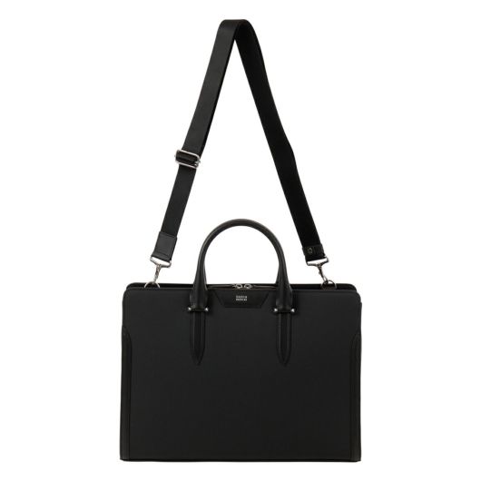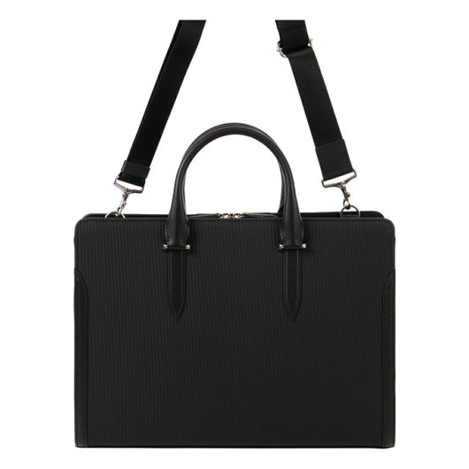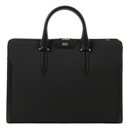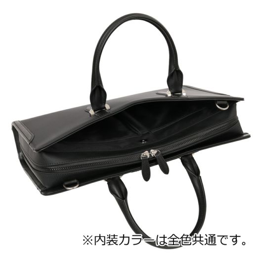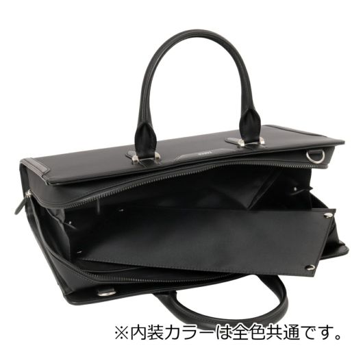 シャープな印象のナイロン絞PVCを使用。表面強度と防水性に優れ、かつ高級感のあるルックスの素材となります。裏基布には、綾織りTRを使用することで軽さと強度を兼ね備えた鞄用資材に仕上げています。ロゴマークは、盛りを入れたレザーパーツにシルバー箔で表現しました。背側のアオリポケットには、取り出し頻度の高いスマートフォンやパスケースの収納に便利なポケット付き。内装収納も充実しており、ファスナーポケットにペン差し、ペットボトルホルダー、小物用ポケット、14inch対応のPCポケットに着脱可能な中仕切り付きです。