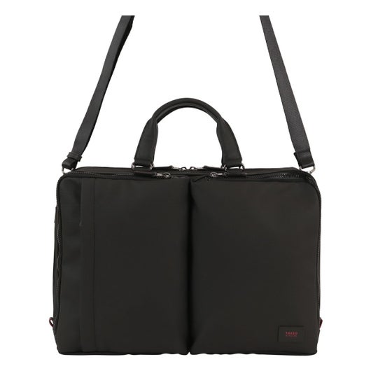 出張にも対応したタケオキクチのA4サイズビジネスバッグ。斜め掛けとしても使える肩紐付きの2WAYバッグです。従来の出社型「オフィスワーク」と、自宅やシェアオフィスなどオフィスと離れた場所で働く「テレワーク」を組み合わせた働き方が増えた中で柔軟に対応できるよう、13.3インチノートパソコンの持ち運びに対応しています。オールブラックでどんなシーンでも使いやすいビジネスバッグですが、ポイントにさりげなくワイン色を施しています。収納機能抜群で、普段の通勤から短期出張まで幅広く使えるビジネスバッグです。