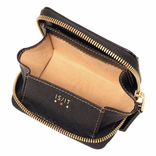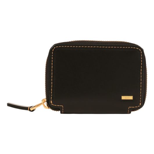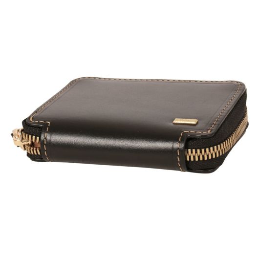 シャープで上品な通夜感が魅力のスムースレザーに、ゴールド色のミニブローチとファスナーが特徴のラウンド小物シリーズ。ゴールドカラーを主張する太エレメントファスナーや断面に傾斜をつけた極小ブローチが小さいながらも主張のあるポイントになります。ヘビタンで鞣された肌目の詰まったスムースレザーをタンナー独自の特殊な手法で艶感をだし、裏地には上質なゴールド色の起毛生地を使用して価値観を高めています。