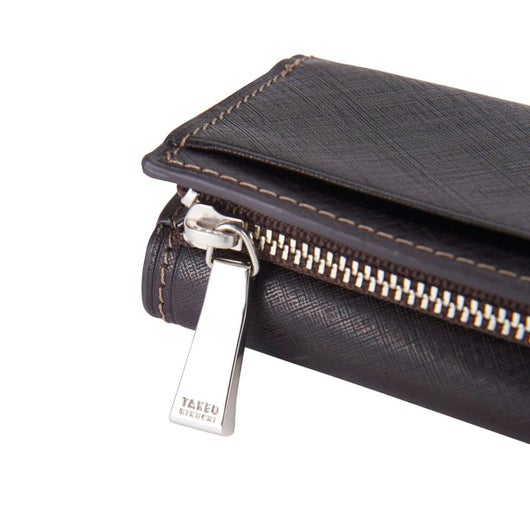 イタリアインポートでしか表現できない特徴的で存在感のある質感、エンボス加工を使用した小物シリーズ。シャープな格子柄をバイアス裁断で使用しています。イタリアベジタブルタンナーズ協会に加盟している【ロ・スティヴァーレ社】の厚口ショルダーをベースにアルゼンチン産の100%タンニンで丁寧に鞣され、北海の青魚と牛の腹脂で油入れを行ない、使い込むことで色や艶感が深まるエイジングが存分に堪能できる素材です。TAKEO KIKUCHIらしさを演出する内装のトリコロール配色やグレンチェックの裏地などもポイントにした、ビジカジテイストのシリーズになります。