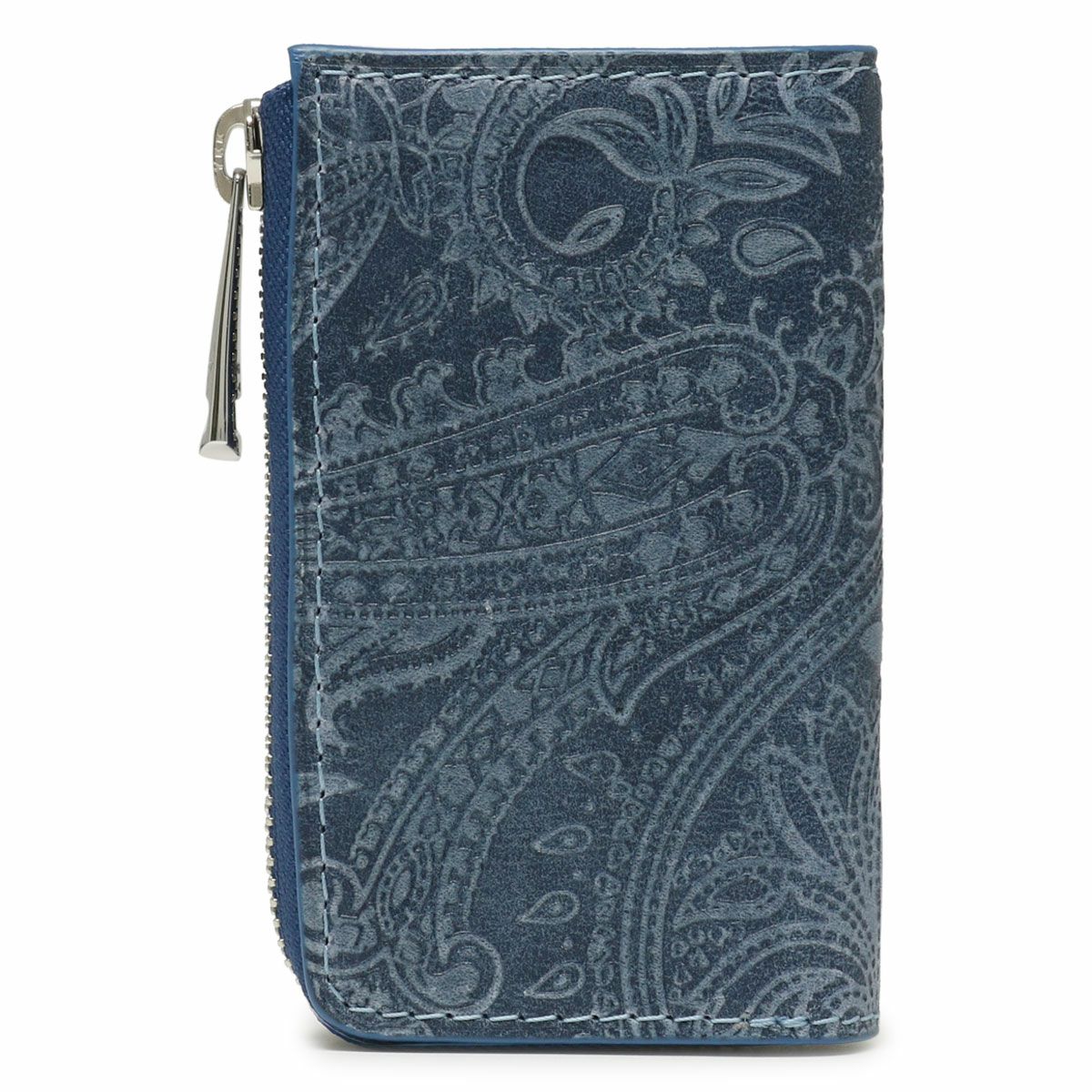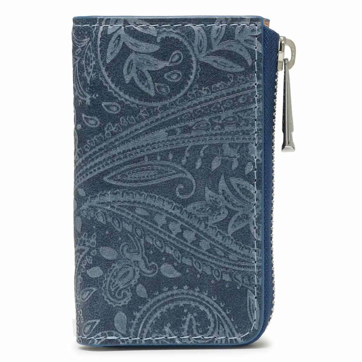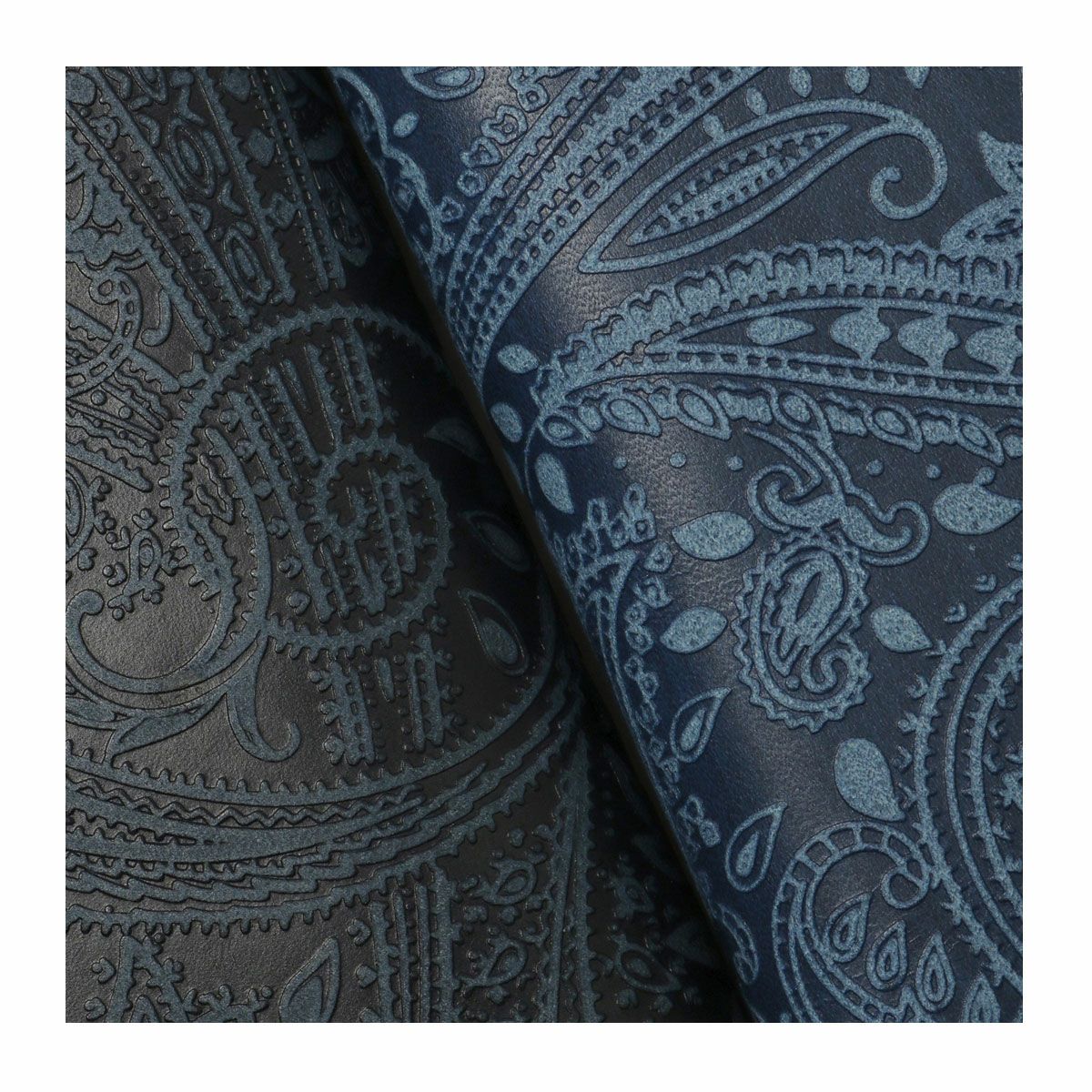 そんな藍染めレザーに、ペイズリー柄の型押しを施し、浮き出た部分に削りを施すことで、細かい柄まで細部に表現しました。
