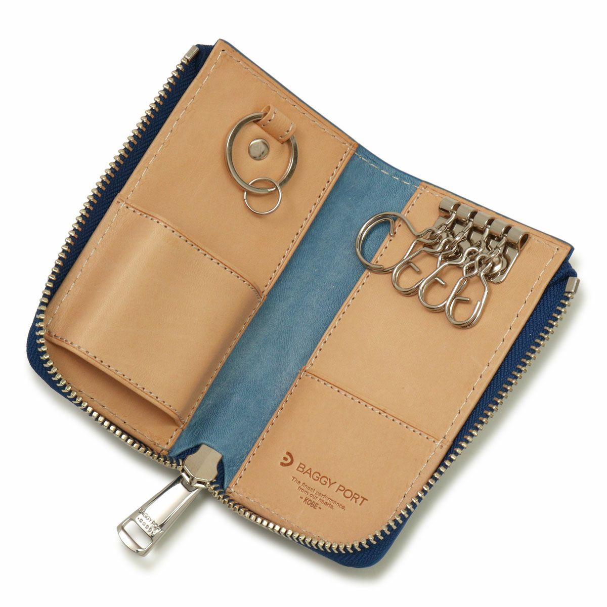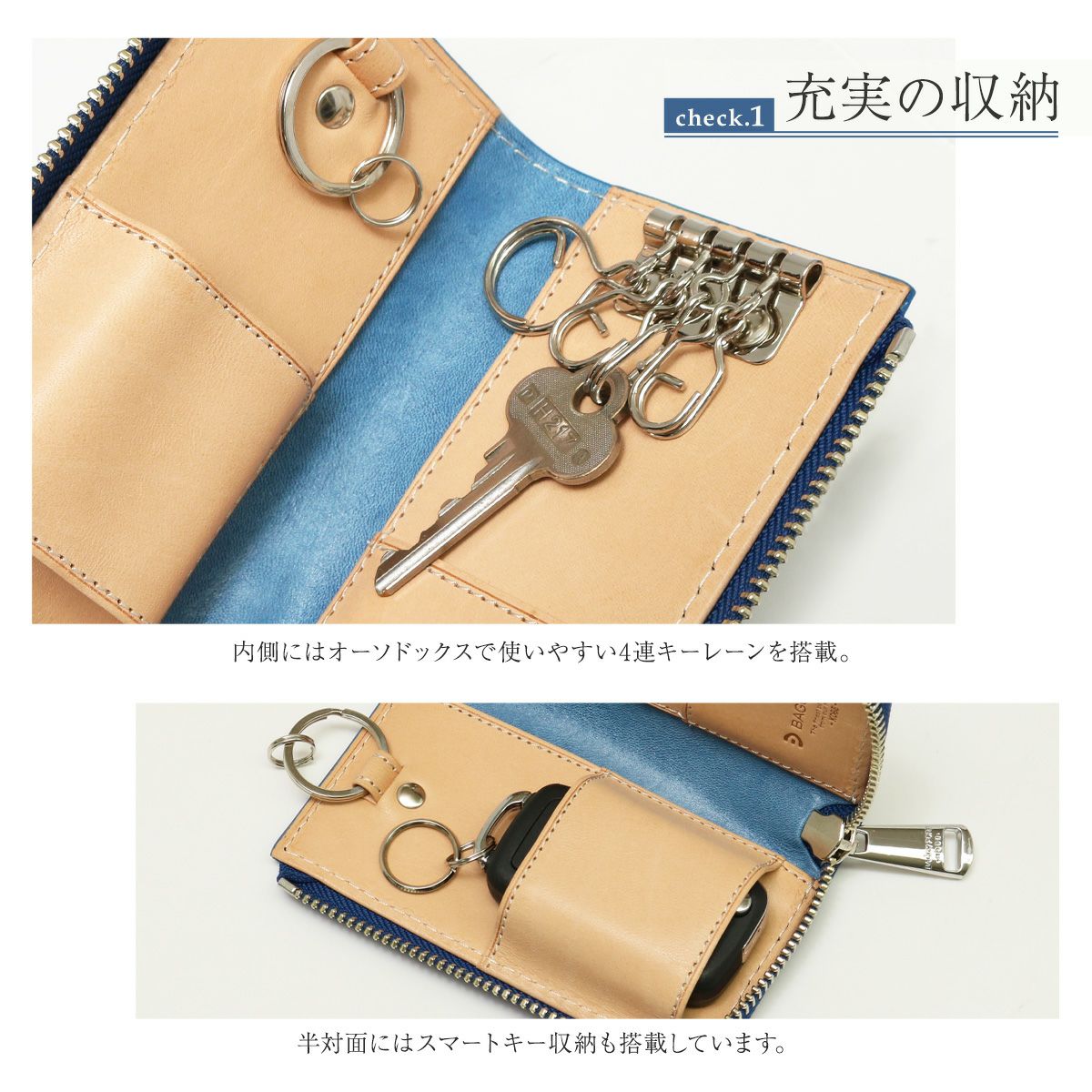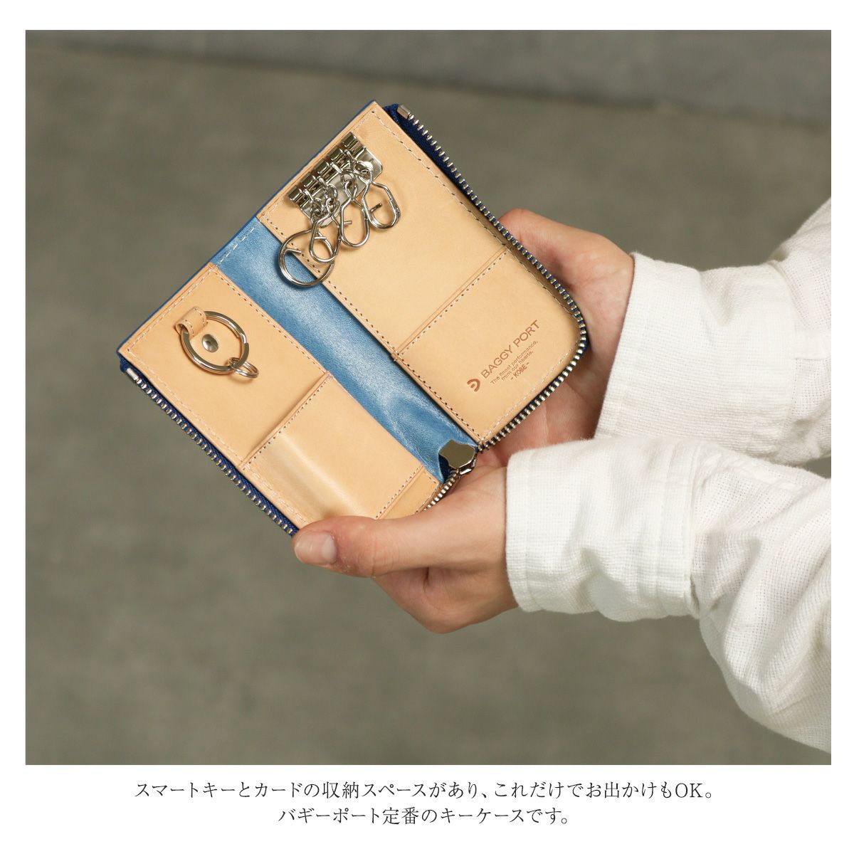スマートキーとカードの収納スペースがあり、これだけでお出かけもOK。バギーポート定番のキーケースです。
