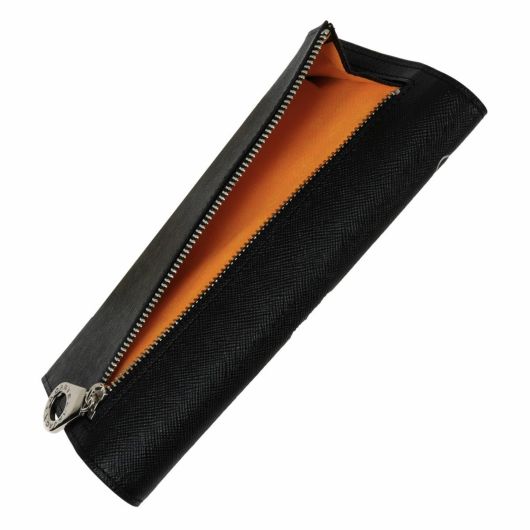 「枠」から王冠が飛び出したイメージの、新しい家紋をポイントにしたカジュアル小物~バッグシリーズ。本体素材はサフィアーノの型押し牛革を使用。家紋はプリントと型押しで表現。