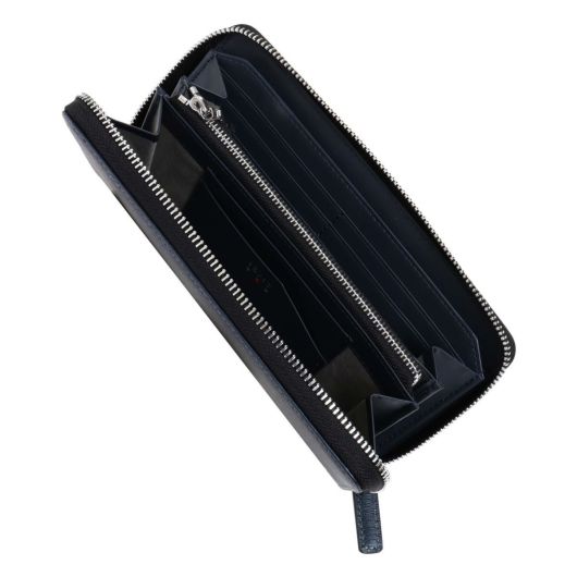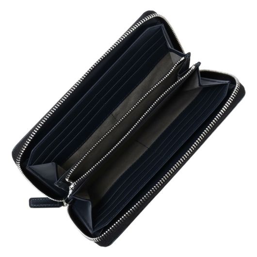 美しい繊細な水シボエンボス加工が施されたレザーを使用しており、水が流れた跡のような上品な模様が特徴です。また、傷や汚れが付きにくく多少の水気にも強い性質を持っているため、日常使いにも安心してお使いいただけます。内装には本体と同色のスムースレザーが使われており、トーン・トーン配色が落ち着いた大人の雰囲気を演出しています。高級感のある立体的なエポキシ樹脂で作られたロゴブローチで、滑らかな光沢感が高級感を一層引き立てます。