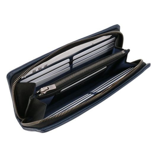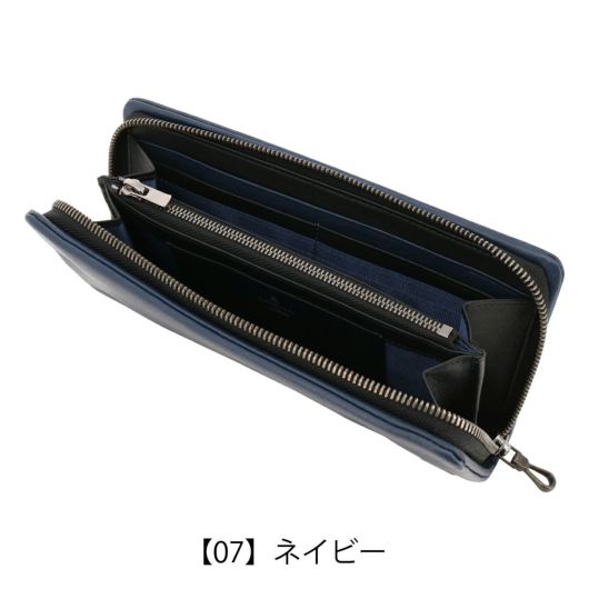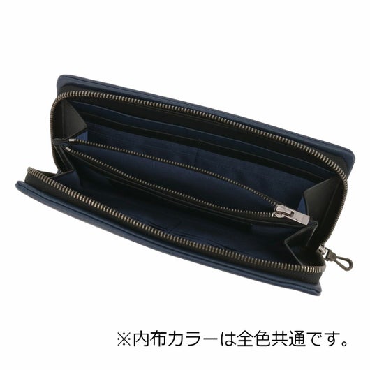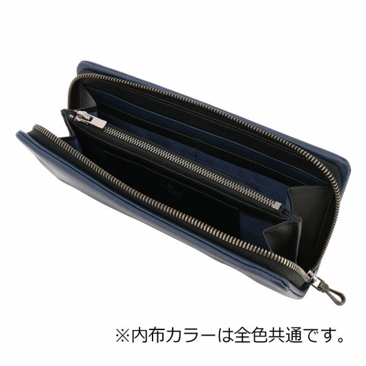 姫路のタンナーで鞣された、国産レザーの風合いを活かして作られたランバンオンブルーのラウンドファスナー長財布。革の特徴をデザインに表現するため、縫い代の目立たない「袋縫い」で縫製しています。また、この縫製方法は、頑丈に仕上がる事も特徴の一つです。本体パーツには、シンプルになり過ぎないように、ブランドロゴが入ったオリジナルのメタルブローチをアクセントに加えています。