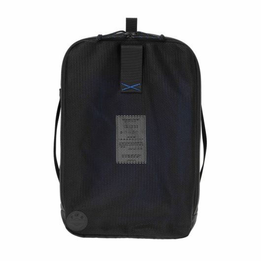 メイン素材は撥水・防汚効果のあるテフロン加工を施した軽量なナイロンツイルを使用しており、旅先の急な雨でも安心して使うことができます。内装には視認性の良い鮮やかなマリンブルーカラーの生地を採用しました。同色の補強ステッチをドローコードや前ポケットに施し、デザインのアクセントにしています。