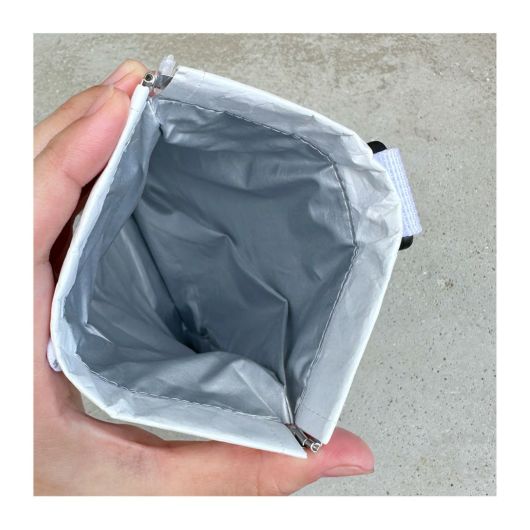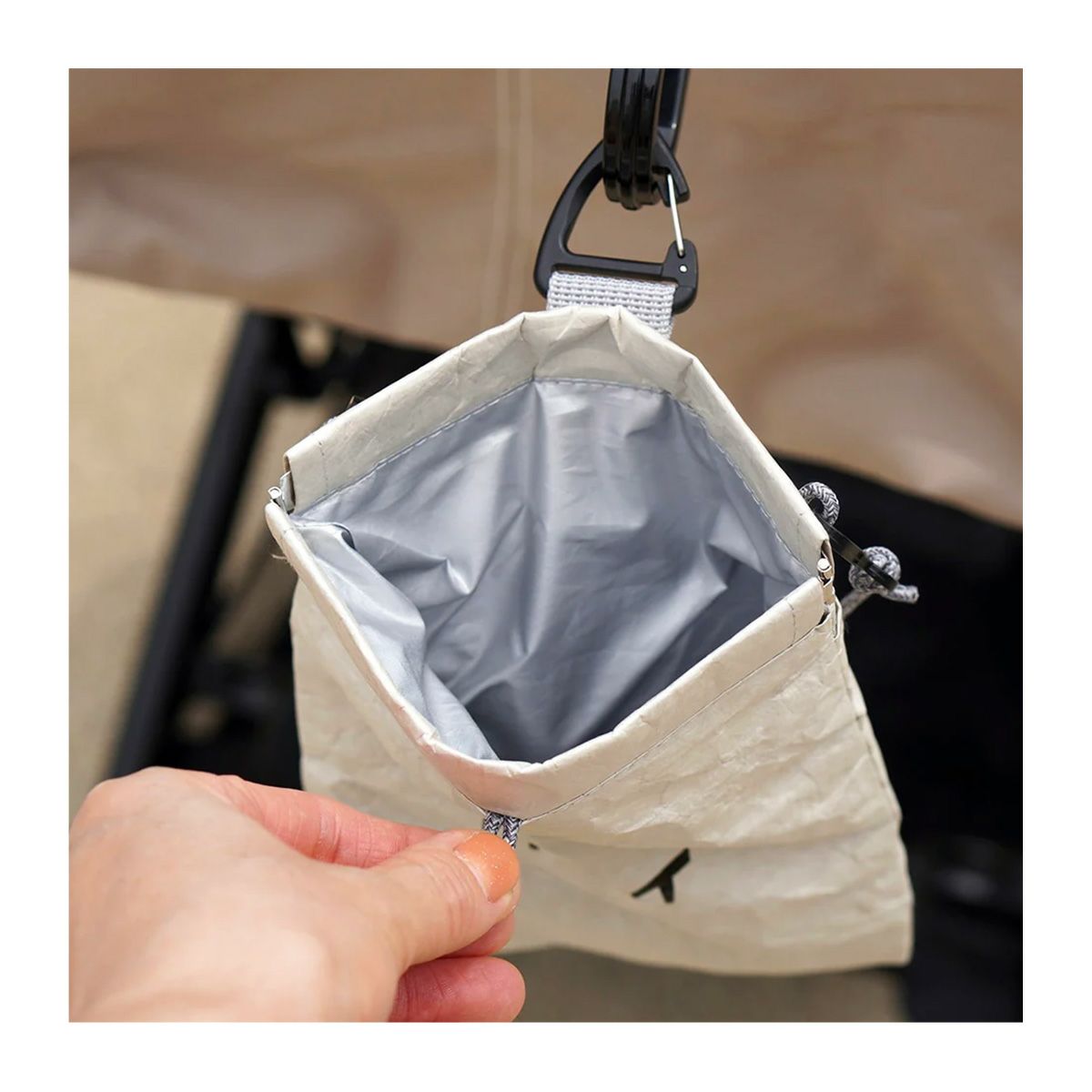 口元はばね口仕様で片手で簡単に開けられます。また、口元のループとカラビナを持って開閉することも可能です。パカっと閉じて中のゴミが出てしまう心配もありません。内側にはふき取ることができる素材を使用しています。