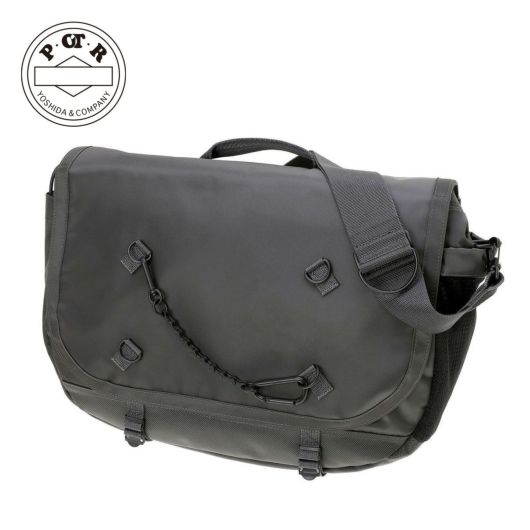 メッセンジャーバッグは大容量のメイン収納部と、内装に16inchのPCを収納できるクッション材入りのポケットを設けています。サイドポケットには600mlのペットボトルや折り畳み傘を収納することができます。背面側の上部にファスナーを設けることで内装に直接アクセスできる仕様で、フラップを開けなくてもPCや荷物を取り出すことが可能です。また、収納部の口元部分を金具で留めることができる仕様のため、型崩れしにくいのもポイントです。