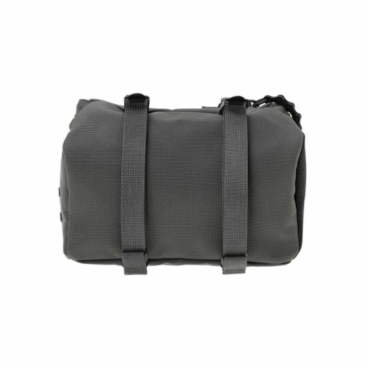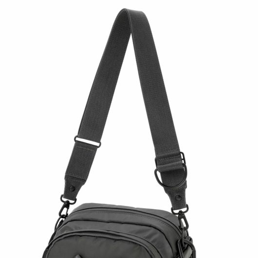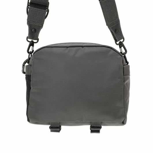 メイン素材にナイロンツイル生地を使用しており、PVC加工を施すことで耐水性を高めています。負荷のかかりやすい底マチ部分にはコーデュラバリスティックナイロンを採用し、耐久性も上げました。本体の前面や底面に身の回りのものを簡易的に固定して持ち運ぶことができるスリングバインダーも配しています。バックパックやウエストバッグはテープをクロスさせることで、見た目のアクセントにしました。ショルダーストラップはワンアクションで滑らかな調節が可能な画期的な仕様です。