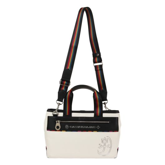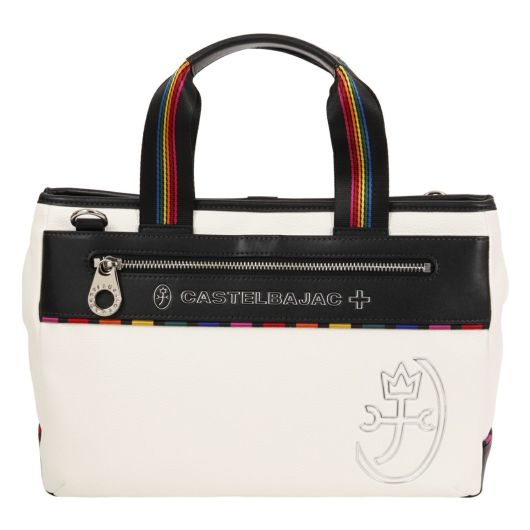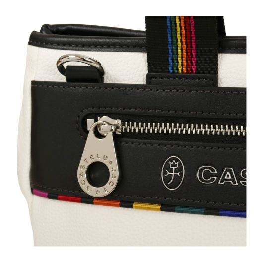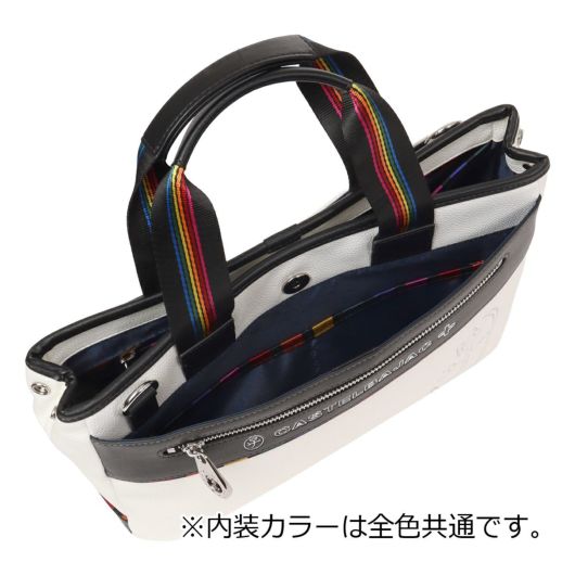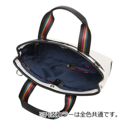 特殊なメタル表現とブランドアイコンであるマルチストライプをジャガード生地に施した「JUNE」シリーズ。シボ感のハッキリとしたシュリンク調合皮を使用。PVCをベースにしてトップをPUで仕上げた耐久性が高く、加水分解のしにくいのが特徴。ブランドを象徴するレインボーカラーのオリジナルジャガート生地を先染の凹凸のあるグログランで織り上げ、価値観と個性をより高めます。凹み部分に金属調シリコンを埋め込む様な手法で、フラットさを表現する小技も見逃せないポイント。