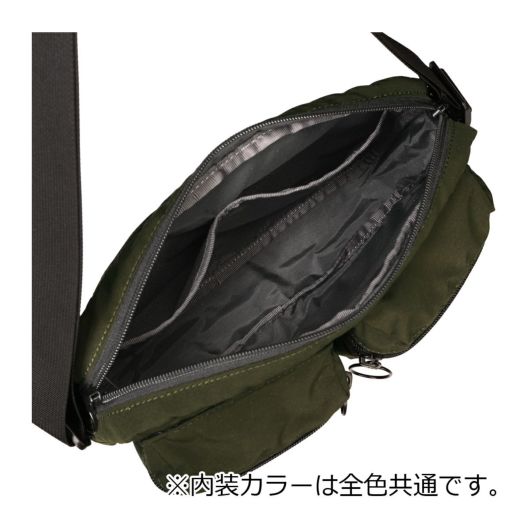 デイリーユースに活躍するコンパクトサイズのショルダーバッグです。500mlのペットボトルも横向きに収納でき、全面にもファスナータイプのポケットが備わっているので、普段使いはもちろん旅行時にもぴったりなアイテムになっています。メインルームにはポケットを備えているので小物の整理もしやすくなっています。また、ハンドタオルや財布、ポーチなど普段使いの多いアイテムもしっかり収納できるサイズになっています。リング状の引手はワンポイントかつ開閉動作がしやすく機能的になっています。