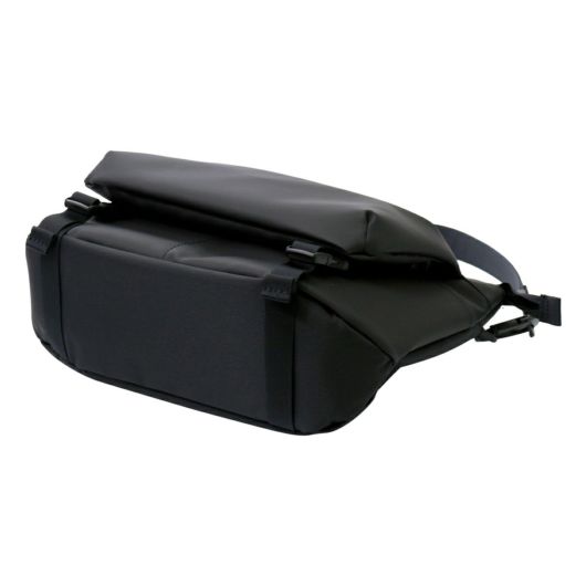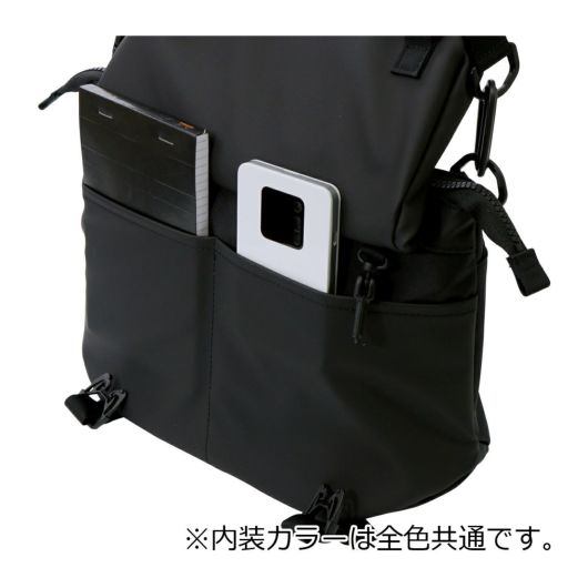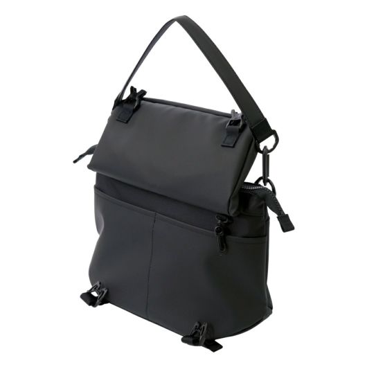 全体的に革や金属のパーツを使わず、生地も機能性を保ちつつ軽量な物を使っておりますので、軽量な仕上がりになっております。本体は肩掛け様ベルトとショルダーベルトが付属しており、用途に応じて使い方を変える事が可能です。