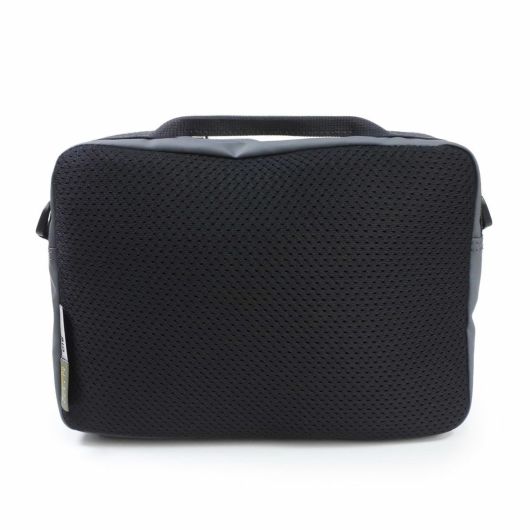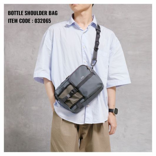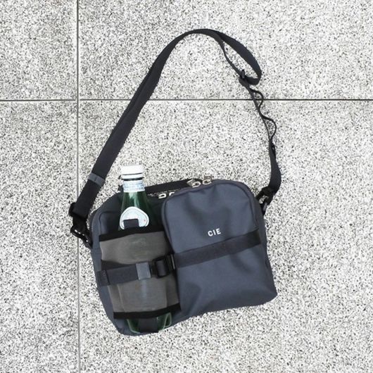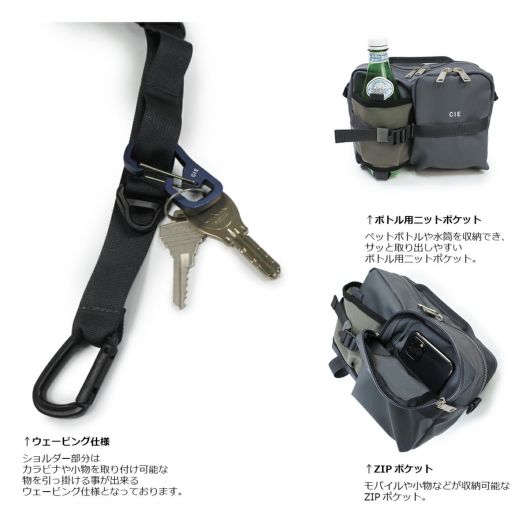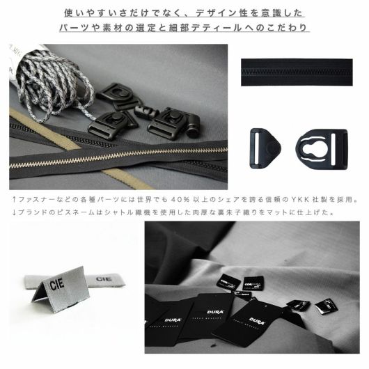 本体生地はINVISTA社に依頼し開発したオリジナルマテリアルCORDURAR POLYCARBONATEを使用しています。ベース生地には摩擦、引裂きに強い耐久性に優れたCORDURAR305Dポリエステルオックスの表面に通常のPUコーティングに比べ耐摩擦性、耐摩耗性、耐光性、加水分解による劣化スピードが遅い耐久性に優れたポリカーボネイト加工を施した防水性、撥水性に優れた素材を使用しております。 前面にはボトル用ニットポケットとモバイルや小物などが収納可能なZIPポケットを配しております。またテープディティールは高密度で織られた畝が特徴的なミリタリーライクな高密度のトジ織のナイロンテープを使用しており、ショルダー部分は物を引っ掛ける事が出来るウェービング仕様となっております。