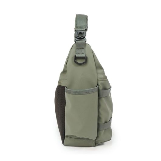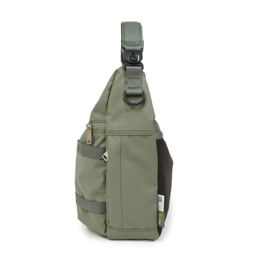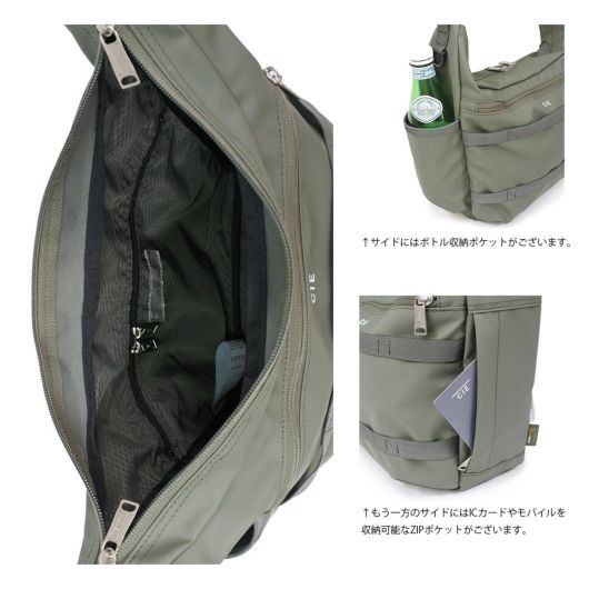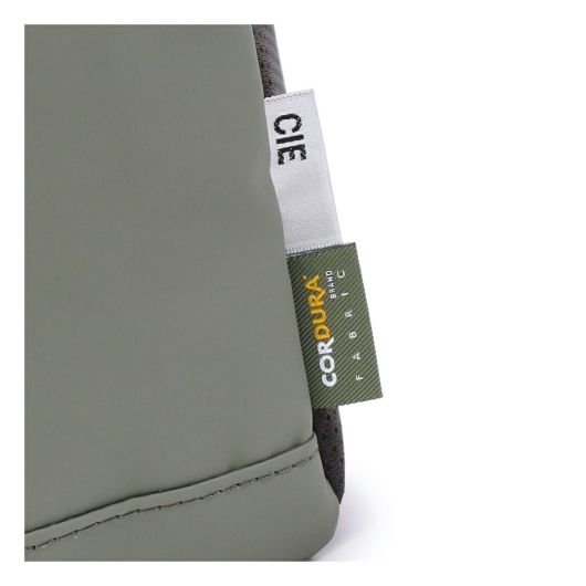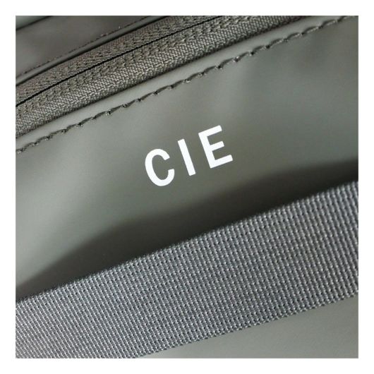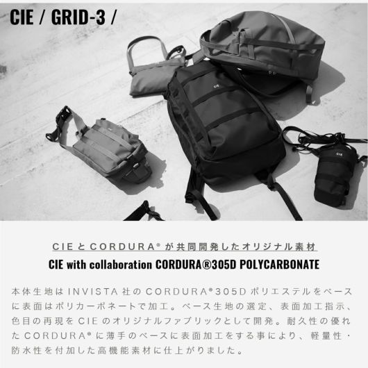 本体生地はINVISTA社に依頼し開発したオリジナルマテリアルCORDURAR POLYCARBONATEを使用しています。ベース生地には摩擦、引裂きに強い耐久性に優れたCORDURAR305Dポリエステルオックスの表面に通常のPUコーティングに比べ耐摩擦性、耐摩耗性、耐光性、加水分解による劣化スピードが遅い耐久性に優れたポリカーボネイト加工を施した防水性、撥水性に優れた素材を使用しております。カラーはCIE別注色の炭がかった独特の「BLACK」とヨーロッパのミリタリーウェアに見られるセージグリーンにインスパイアされた「OLIVE」、はポーランド軍のミリタリーネイビーに触発された彩度の低いネイビー色「NAVY GRAY」の3色展開となっております。またCORDURA別注織ネームはCIEオリジナルのオリーブカラー、CIEオリジナルネームは昔ながらのシャトル織機で織られたバックサテンのネームとなっております。ZIPにはCIEオリジナル亜鉛ダイキャストのYKK製引手を使用しております。