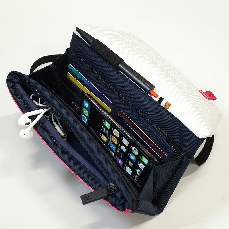 マグネットタイプでスムーズに開閉できるフラップを開けると、中には細かく仕切られたポケットが出現。