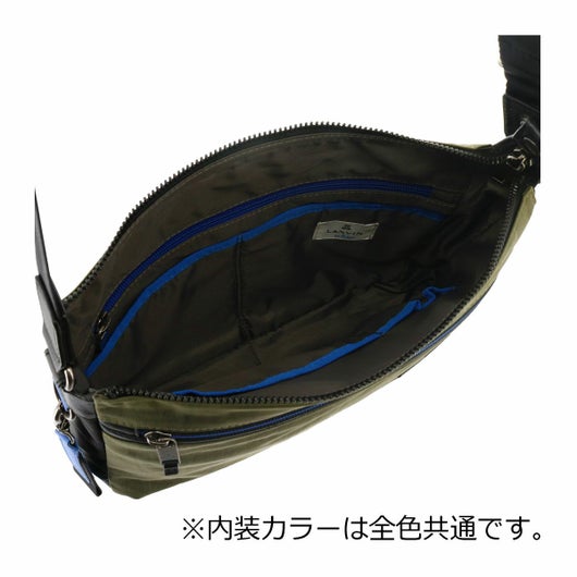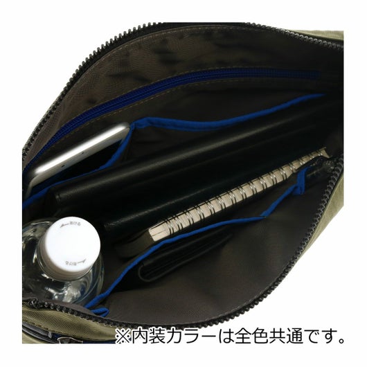 本体前身頃に弱撥水加工を施したシワナイロンツイルを使用し、負荷の掛かるマチ部分には強度面にも優れた1680dバリスティックナイロンを使用。付属には撥水加工を施したスムース牛革を使用し、素材感はメリハリのある異素材をMIXした仕様に。前身頃には、中央に細いブルー色のラインが入ったオリジナル裏使いファスナーを使用し、随所にブルー色パーツを用いてLVBブランドらしさも表現。