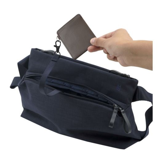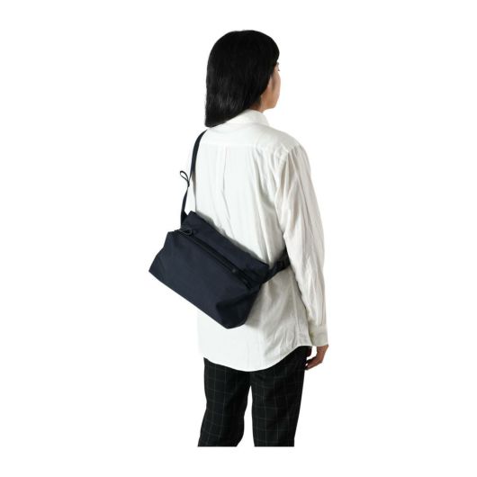 シーンを選ばず、持ちやすいショルダーバッグ。外装はシンプルながら、内装にはガジェット用のスリーブポケットや、鍵などの貴重品をホールドできるナスカン付きのロングストラップを装備。バックルにはフィドロックを採用しているので、アウターの下でも脱着がスムーズ。