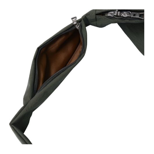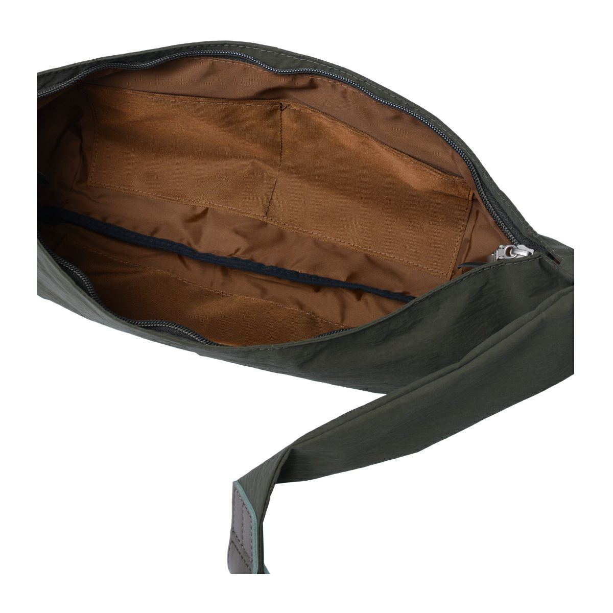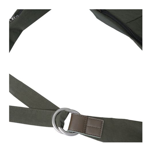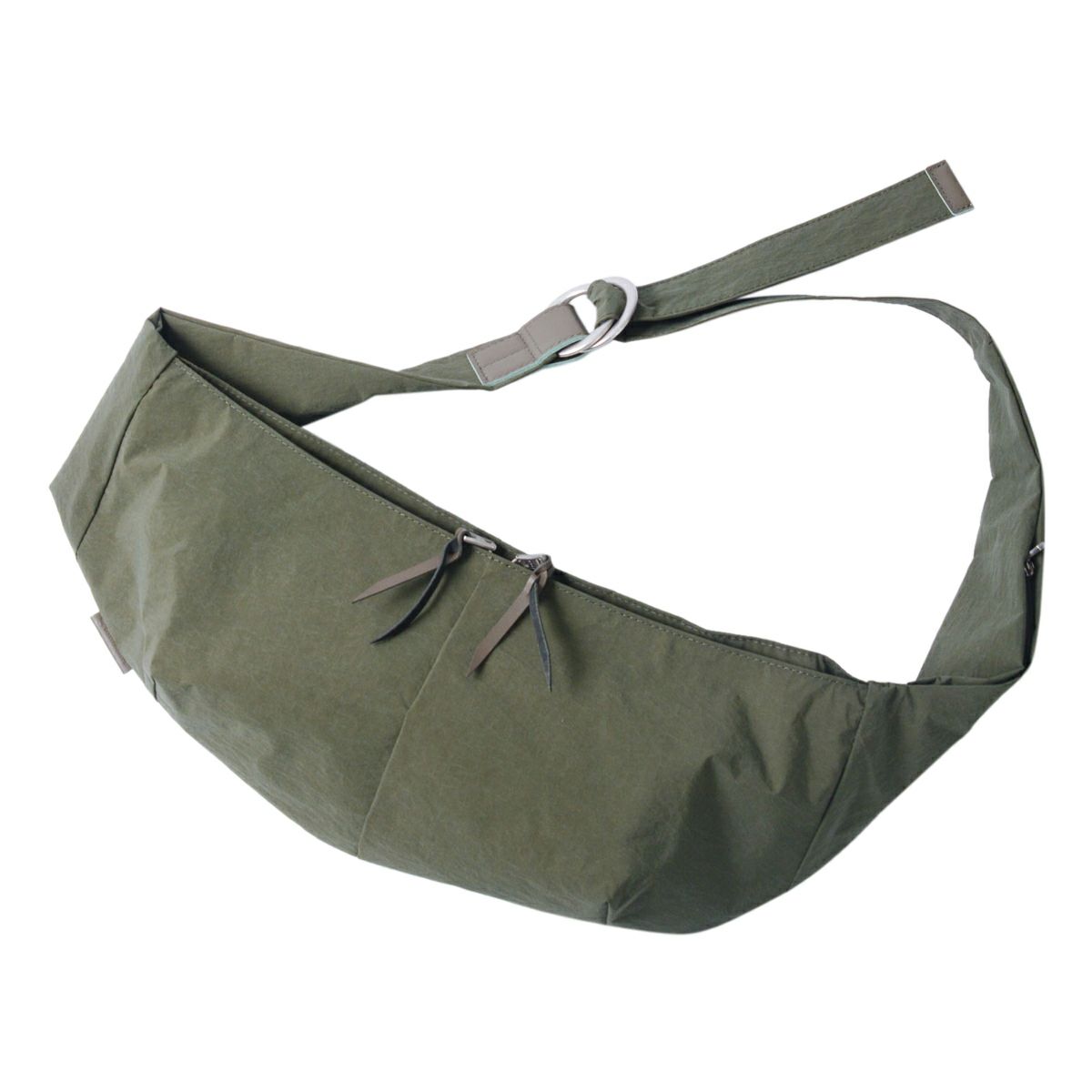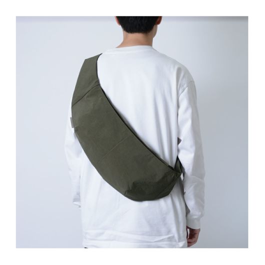 本体生地には、製造工程において発生した廃棄物を再利用したプレコンシューマ・リサイクルナイロン糸を平織りした生地に小松マテーレ(株)のKONBU(R)-Nという特殊加工を施した素材を使用。自立するほどの硬度と引き裂きへの強度がありながら手に持ってみると驚くほどの軽さがあることが特徴です。