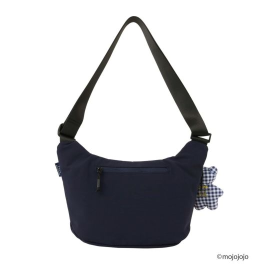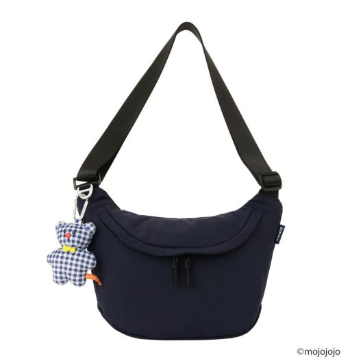 mojojojoコラボのオリジナルチャーム付きラウンドショルダー(S)。ブルーチェックのボディに、イエローのボウタイを付けたBOYNAカラーのくまちゃんチャームを特別に制作しました。ハート型のお鼻もさりげないアクセントです。