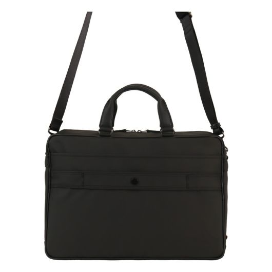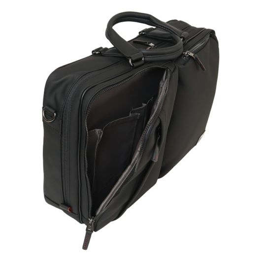 出張にも対応したタケオキクチのA4サイズビジネスバッグ。斜め掛けとしても使える肩紐付きの2WAYバッグです。従来の出社型「オフィスワーク」と、自宅やシェアオフィスなどオフィスと離れた場所で働く「テレワーク」を組み合わせた働き方が増えた中で柔軟に対応できるよう、13.3インチノートパソコンの持ち運びに対応しています。オールブラックでどんなシーンでも使いやすいビジネスバッグですが、ポイントにさりげなくワイン色を施しています。収納機能抜群で、普段の通勤から短期出張まで幅広く使えるビジネスバッグです。