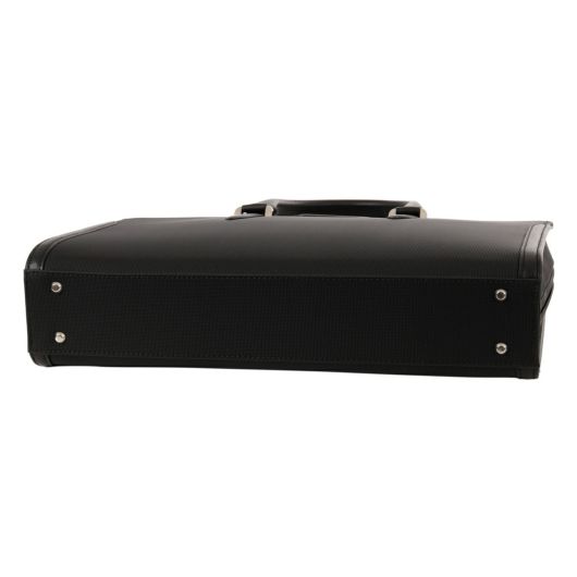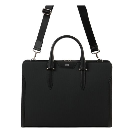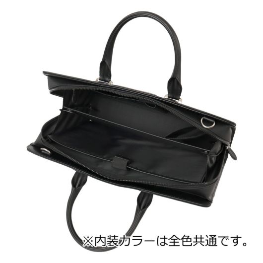 シャープな印象のナイロン絞PVCを使用。表面強度と防水性に優れ、かつ高級感のあるルックスの素材となります。裏基布には、綾織りTRを使用することで軽さと強度を兼ね備えた鞄用資材に仕上げています。ロゴマークは、盛りを入れたレザーパーツにシルバー箔で表現しました。背側のアオリポケットには、取り出し頻度の高いスマートフォンやパスケースの収納に便利なポケット付き。内装収納も充実しており、ファスナーポケットにペン差し、ペットボトルホルダー、小物用ポケット、14inch対応のPCポケットに着脱可能な中仕切り付きです。