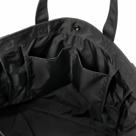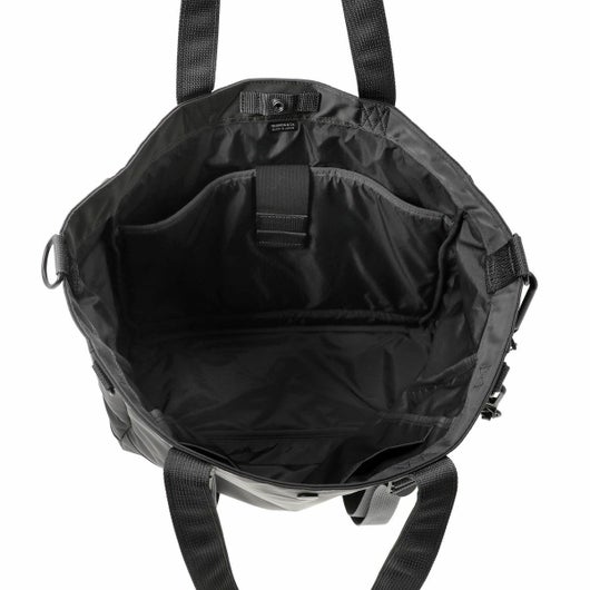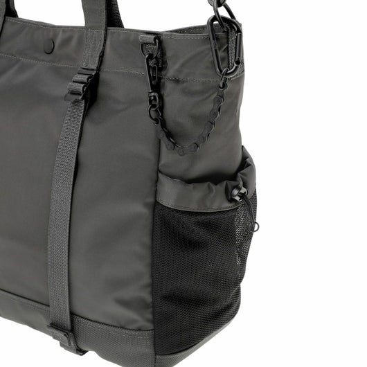 2WAYトートバッグ(L)は大容量のメイン収納部内に14inchのPCを収納できるクッション材入りのポケットを設けた、オン・オフどちらのシーンでも使いやすいアイテムです。ハンドルは肩掛けにも対応しています。サイドのポケットには600mlのペットボトルや折り畳み傘が収納できます。
