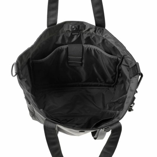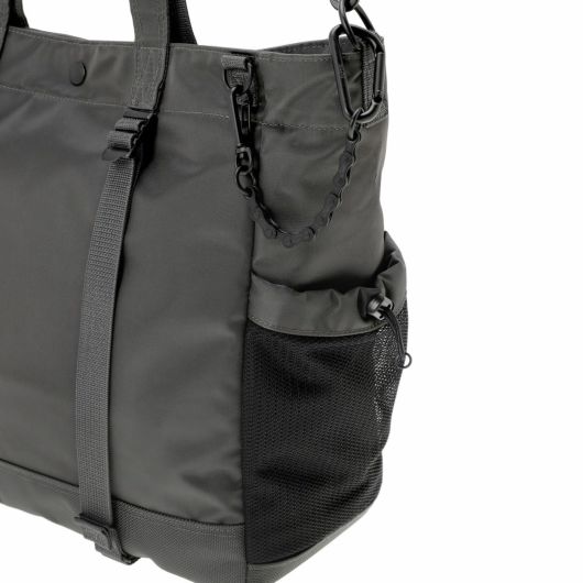 メイン素材にナイロンツイル生地を使用しており、PVC加工を施すことで耐水性を高めています。負荷のかかりやすい底マチ部分にはコーデュラバリスティックナイロンを採用し、耐久性も上げました。本体の前面や底面に身の回りのものを簡易的に固定して持ち運ぶことができるスリングバインダーも配しています。バックパックやウエストバッグはテープをクロスさせることで、見た目のアクセントにしました。ショルダーストラップはワンアクションで滑らかな調節が可能な画期的な仕様です。