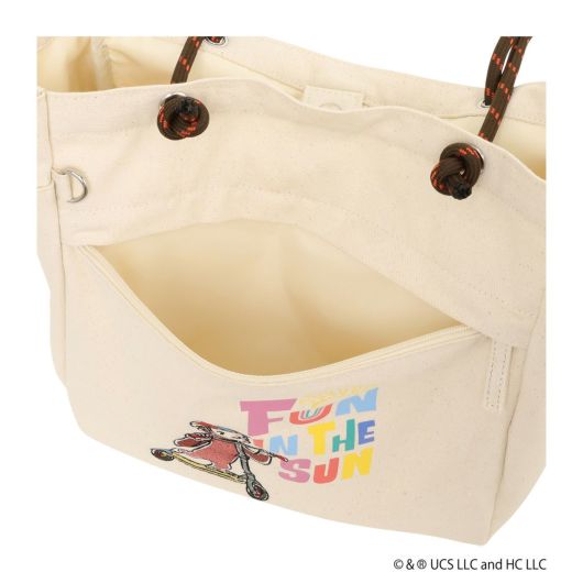 前面にジョージの刺繍とプリントデザイン、とってもカラフルな可愛いバッグとなっております。背面にもプリントデザイン。缶バッチ付き。コードハンドルハトメデザイン。